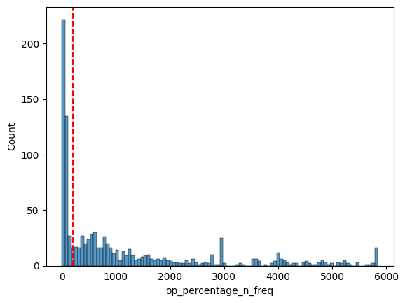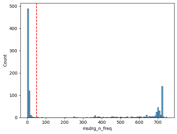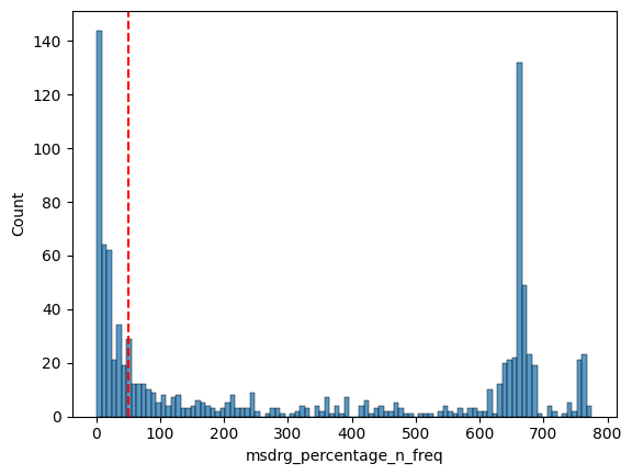 As an example, the rightmost bar shows that there are ~20 payer-network-providers that reported ~5800 HCPCS codes with an identical percentage rate. The red dotted line reflects the 200-code threshold.